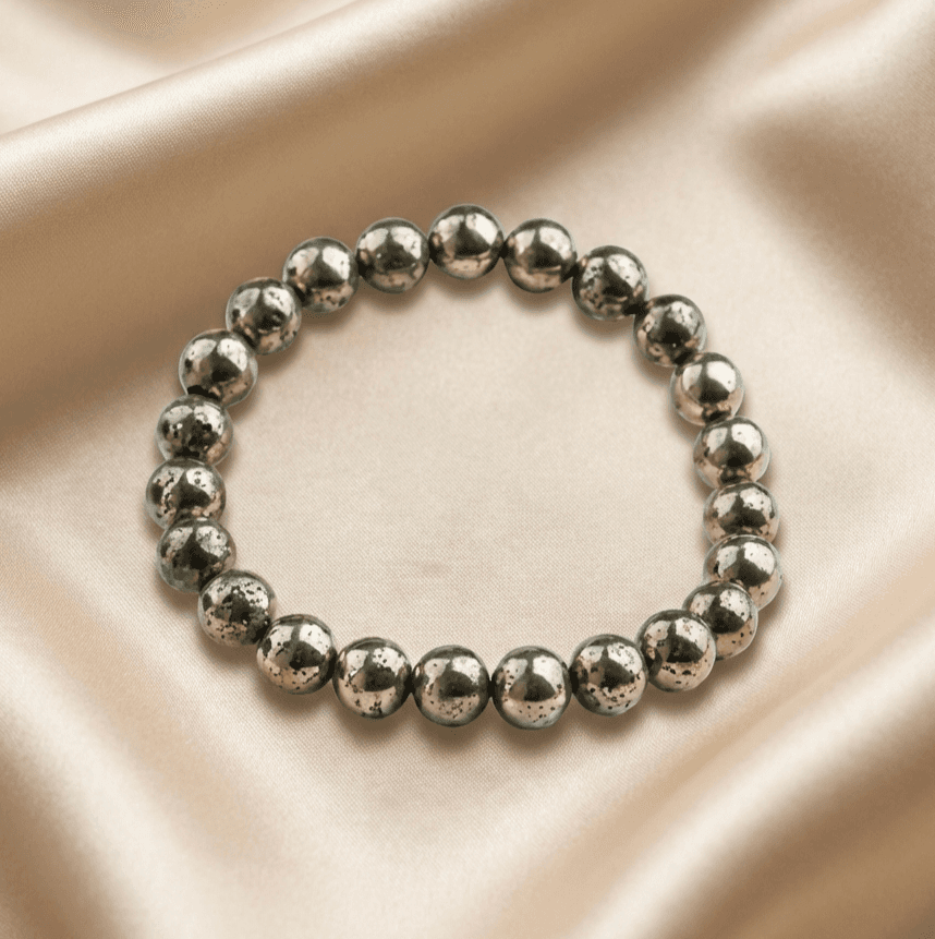 Pyrite, often called "fool's gold," is a striking iron sulfide mineral prized for its metallic luster and cubic crystal formations. This bracelet showcases natural pyrite's distinctive brassy-gold appearance and geometric beauty. Pyrite is traditionally associated with prosperity, confidence, and protective energy in crystal practices. The bracelet's polished finish highlights the mineral's reflective qualities, making it an eye-catching accessory for both collectors and those drawn to its metaphysical properties. Each piece displays the unique variations inherent to natural stone, ensuring individuality in every wear.